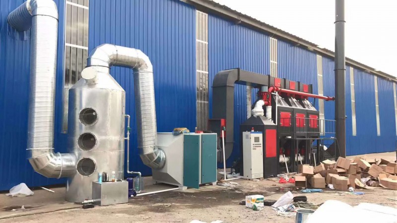 废气进行有效收集后,行预处理,再进入活性炭吸附装置,气体在活性炭床层保持一定的停留时间,气体中的VOCs被吸附在活性炭表面,洁净气体从活性炭床层排出后可以直接通过引风机排空,经过RCO处理后的洁净气体通过热交换到一定温度后作为脱附风,通过活性碳床进行脱附,从活性炭吸附装置脱附出来的浓缩有机物进入RCO装置后通过贵金属催化剂燃烧分解,分解温度在200-250℃,有机废气被分解成二氧化碳和水,以此循环,待废气脱附分解完成后排入烟筒后达标排放。